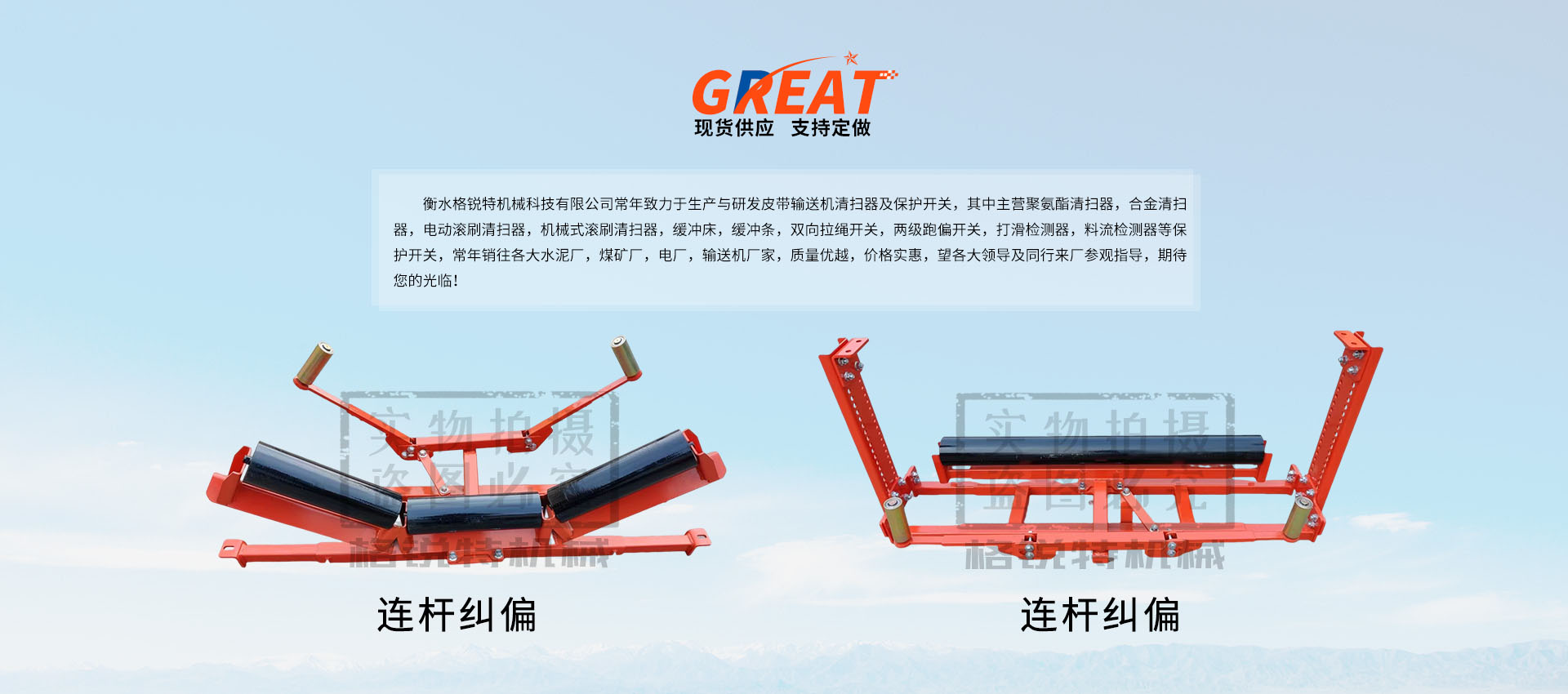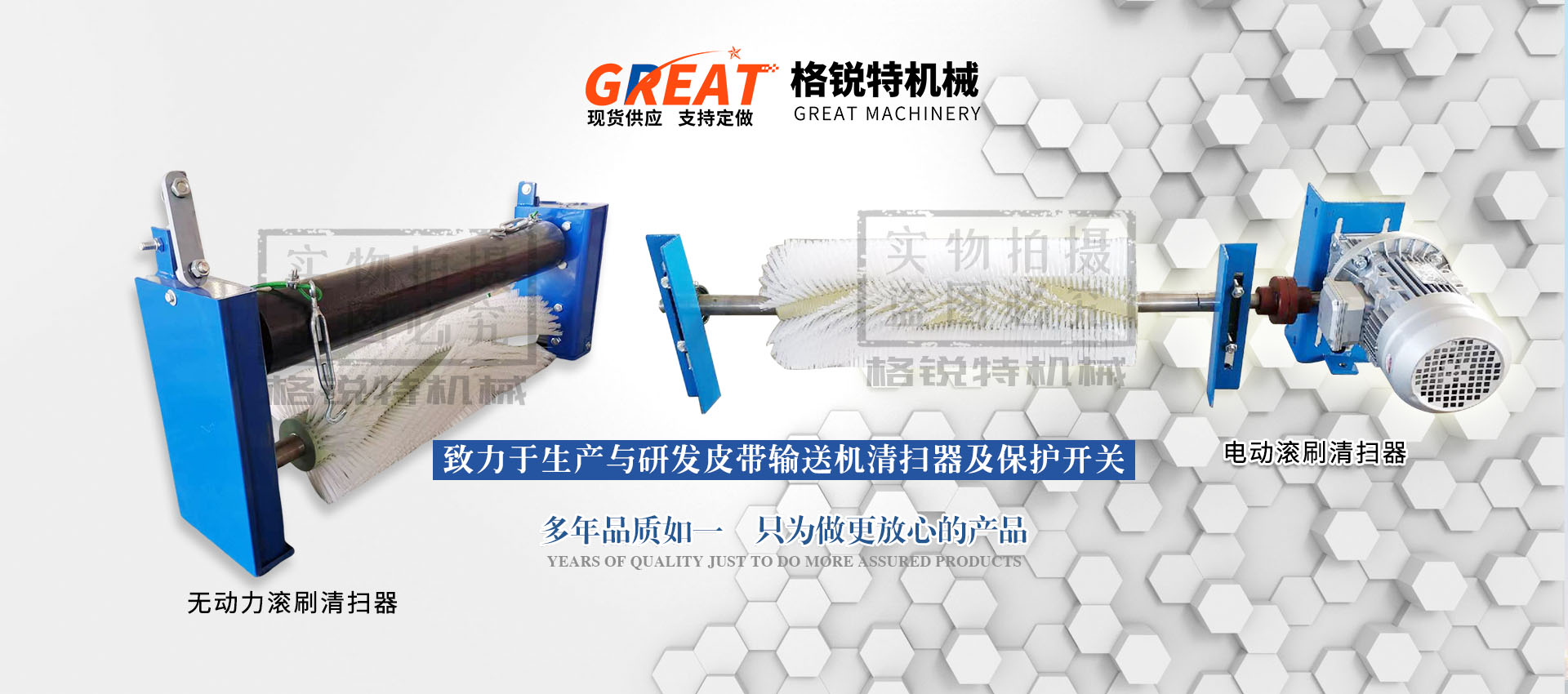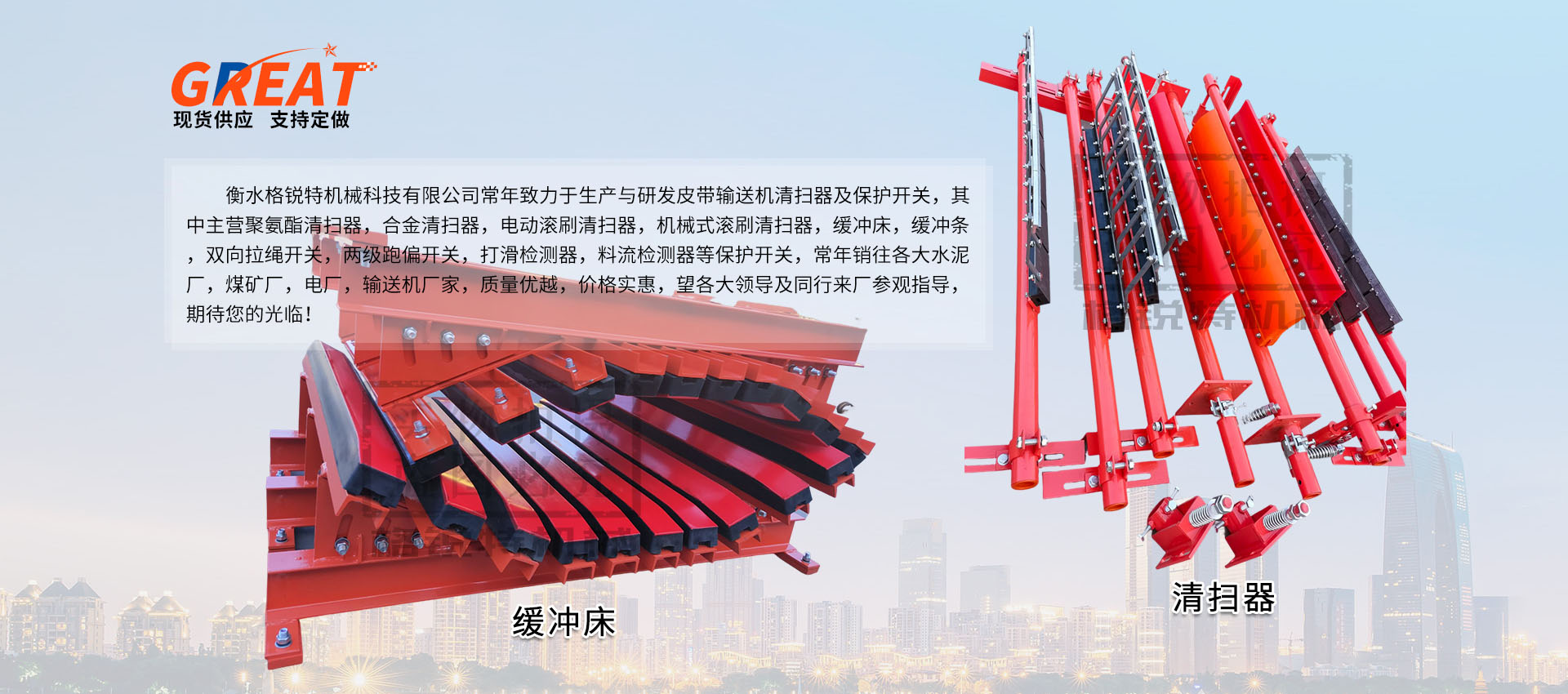 衡水格銳特機(jī)械科技有限公司常年致力于生產(chǎn)與研發(fā)皮帶輸送機(jī)清掃器及保護(hù)開關(guān),其中主營聚氨酯清掃器,合金清掃器,電動滾刷清掃器,機(jī)械式滾刷清掃器,緩沖床,緩沖條,雙向拉繩開關(guān),兩級跑偏開關(guān),打滑檢測器,料流檢測器等保護(hù)開關(guān),常年銷往各大水泥廠,煤礦廠,電廠,輸送機(jī)廠家,質(zhì)量優(yōu)越,價格實惠,望各大領(lǐng)導(dǎo)及同行來廠參觀指導(dǎo),期待您的光臨!!!